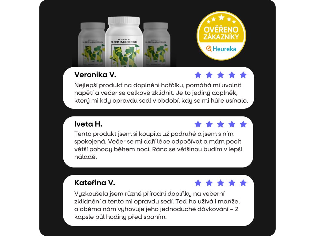 Dávkování: 2 kapsle 30 minut před spaním nebo 1 kapsli během dne. Doporučujeme užívat po tréninku, v odpoledních či večerních hodinách ke snížení kortizolu (stresového hormonu). Doporučujeme užívat na lačno, protože na prázdný žaludek se hořčík mnohem lépe vstřebává. BrainPedia.cz - místo nabité informacemi! Se správnými informacemi nelze udělat špatné rozhodnutí. Velikost dávky: 2 rostlinné kapsle Balení obsahuje 50 dávek. Množství v 1 dávce %RHP* Magnesium bisglycinát MagChel® Mg +20 1600 mg Z toho elementární hořčík 320 mg 85% Šťáva z višně (Prunus Cerasus) 100 mg ** GABA (kyselina gama-aminomáselná) 80 mg ** L-theanin (z extraktu zeleného čaje) 50 mg ** Vitamín B6 (Pyridoxal-5-fosfát) 2,8 mg 200% * % denní referenční hodnoty příjmu**denní referenční hodnota příjmu není stanovena 1. Hořčík, 2. Zelený čaj, 3. Vitamín B6 Nákupem podpoříte i české lesy #stromzaobjednavku!