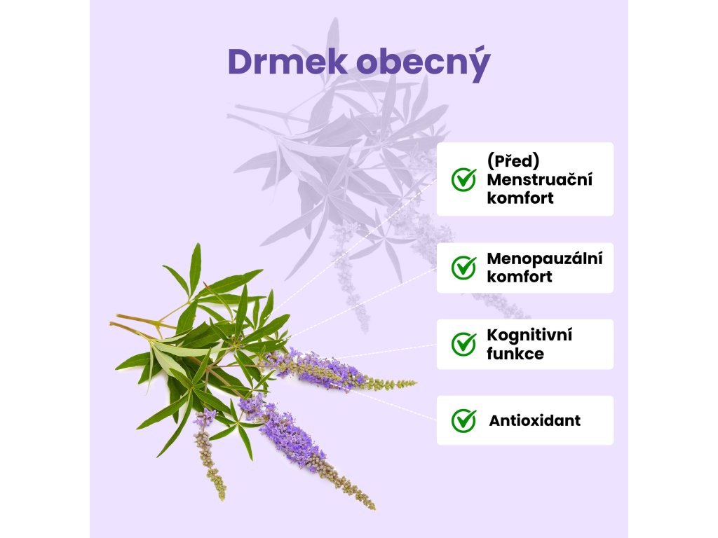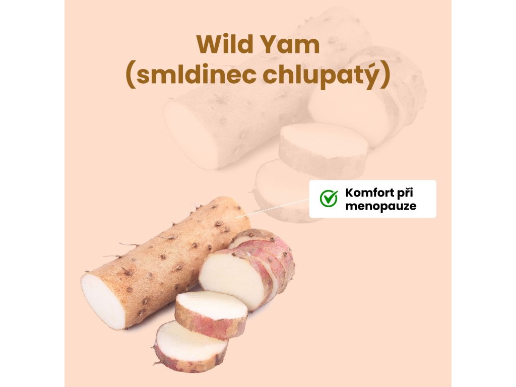 Menopauzální komfort díky bylinám Wild yam a drmku v účinných dávkách. Obsahuje klinicky prokázanou synergicky působící směs 8 látek, včetně bylinných extraktů vhodných pro ženy v menopauze. Byliny jako je andělika čínská, Wild yam nebo drmek obecný, mají prokazatelný vliv na hormonální systém.