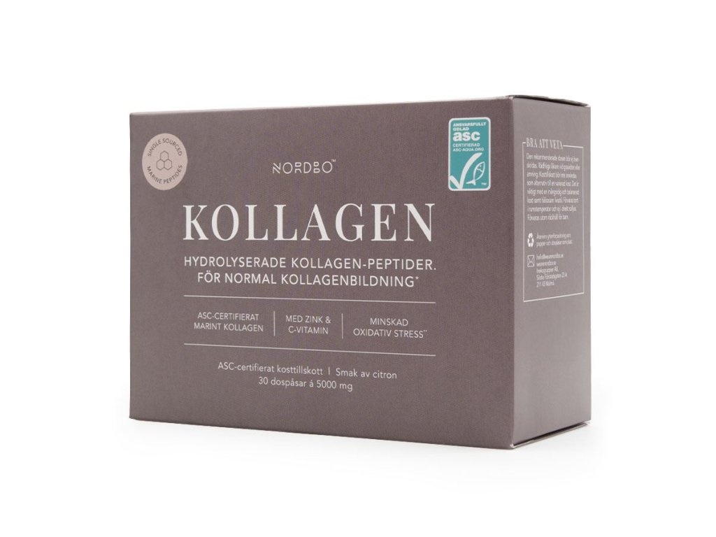 Nordbo Kollagen obsahuje hydrolyzovaný rybí kolagen Ecolovita® s kolagenovými peptidy typu I., přidaný vitamín C ve formě kyseliny L-askorbové a zinek ve formě L-askorbátu zinečnatého. Účinek obsaženého kolagenu Ecolovita® je zdokumentován klinickou studií, přidaný vitamín C a zinek zlepšují využitelnost kolagenu v těle - obě tyto látky jsou v organismu zapojené do jeho přirozené produkce. Nordbo Kollagen má jako jediný doplněk svého druhu na světě prestižní certifikaci ASC, která garantuje udržitelnost produkce a zároveň čerstvost rybí suroviny.