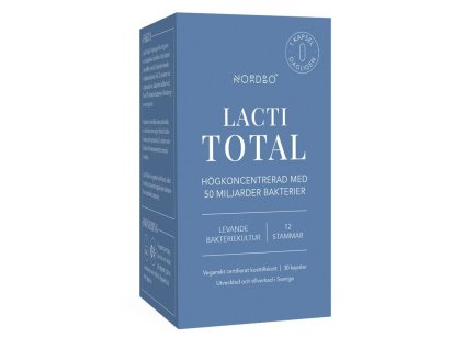 LACTI TOTAL Doplněk stravy s obsahem 12 kmenů bioaktivních živých kultur, inulinu a vitamínu C. - 50 MILIARD ŽIVÝCH KULTUR PRO KOMPLEXNÍ PODPORU STŘEVNÍ SLIZNICE- Špičková kvalita a čistota / Made in Sweden (GMO free)- Vyvážená a silná směs 12 bioaktivních kmenů- Doplněné o prebiotikum (inulin)- Dop...